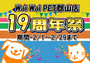 ワイワイペット郡山店は今年で19年目! 19周年を記念して2月29日まで周年祭を開催中です 🎉 今後とも変わらぬご愛顧を賜りますよう よろしくお願いいたします。 皆様のご来店心よりお待ちしております☺